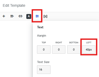 In the email template editor, select the text block and increase the left padding to create the indented look of a traditional bulleted list. A small increase (around 30–40px) is usually enough to visually separate the list from the other content: