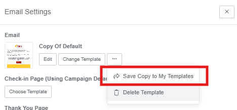You can also save the email to your template library, and delete it after using it. To do this, click the little gear icon in the check-in. In the email section, click the three dots and choose “Save Copy to My Templates”: