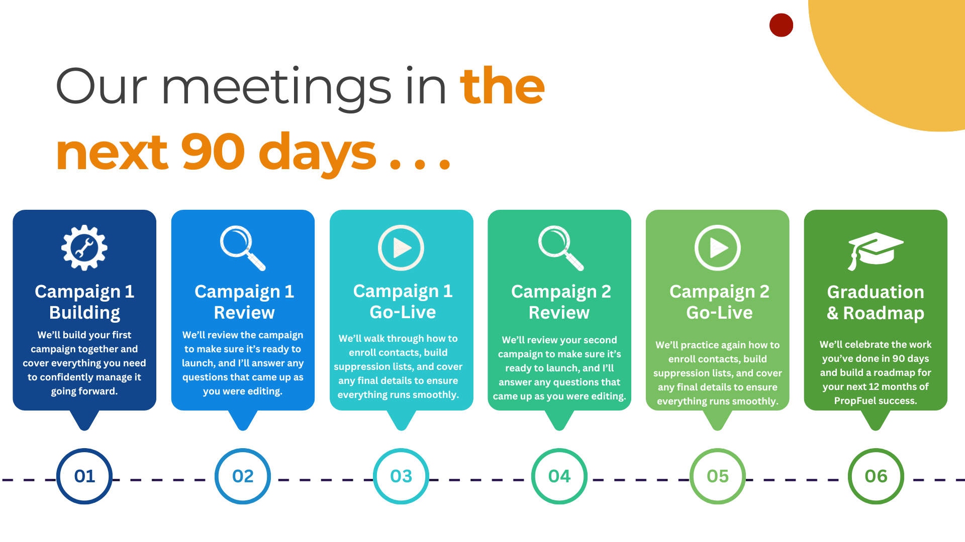 Here’s your onboarding timeline—everything we’ll cover until you graduate and are ready to use PropFuel independently: