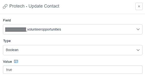 Example: If the field “Volunteer Interest” should be marked Yes in Protech, select Boolean as the type and enter true as the value: